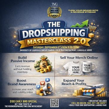 Turn your brand into income at Dropshipping Masterclass 2.0 on Sept 5, 9:30 AM–12 PM at UofL Shelby Campus. Learn passive income strategies, sell online, use Amazon, Etsy, eBay, and Shopify, and build a dropshipping page. Early bird tickets are $100.